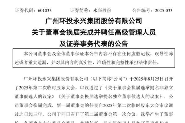 广州环投永兴集团股份有限公司(简称:永兴股份)近日公告称,公司董事会换届已完成,新一届董事会的任期自2025年第二次临时股东大会审议通过之日起三年。同日,公司召开了第二届董事会第一次会议,选举产生了董事长、各董事会专门委员会委员,并聘任新一届高级管理人员和证券事务代表。 一、公司第二届董事会组成情况 (一)董事会成员 董事长:张...