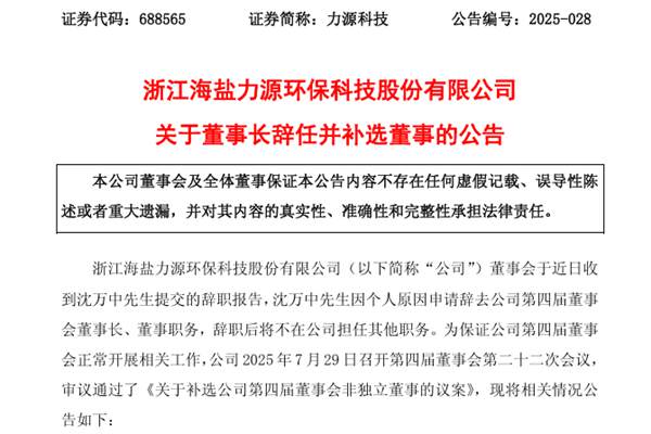 浙江海盐力源环保科技股份有限公司(简称:力源科技)7月30日公告称,公司已收到沈万中先生提交的辞职报告,沈万中先生因个人原因申请辞去公司第四届董事会董事长、董事职务,辞职后将不在公司担任其他职务。图源:力源科技公告 力源科技于2025年7月29日召开第四届董事会第二十二次会议,审议通过了《关于补选公司第四届董事会非独立董事的议案》,...