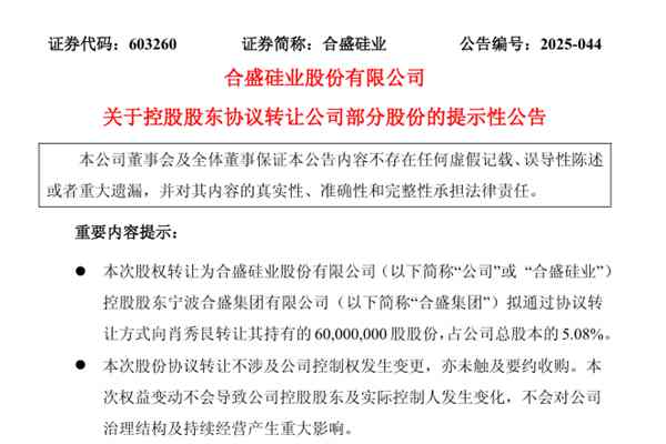 近日,合盛硅业股份有限公司(简称:合盛硅业)公告称,公司近日收到了控股股东宁波合盛集团有限公司(下称“合盛集团”)的通知,因其自身资金需求和上市公司发展需要,合盛集团于2025年7月16日与肖秀艮签署了《合盛硅业股份有限公司之股份转让协议》,拟将持有的6000万无限售流通股(占公司总股本的5.08%)通过协议转...