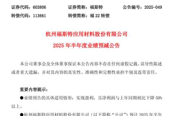 光伏胶膜上市企业杭州福斯特应用材料股份有限公司(简称:福斯特)近日发布了《2025年半年度业绩预减公告》。报告期内,福斯特预计实现归母净利润4.73亿元,同比大幅下降49.05%;扣非净利润4.26亿元,同比降幅达52.65%。 福斯特认为,公司本期业绩预减的主要原因包括: 1、受光伏行业产能过剩,市场竞争加剧等影响,与上年同期相...