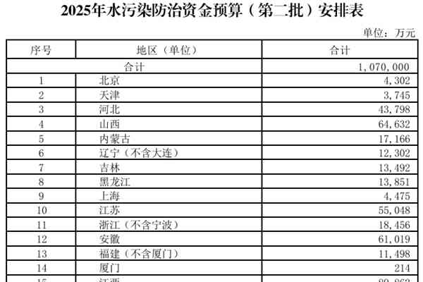 近日,财政部发布《关于下达2025年水污染防治资金预算(第二批)的通知》,共计107亿元。 详情如下↓ 财政部关于下达2025年水污染防治资金预算(第二批)的通知 财资环〔2025〕61号 各省、自治区、直辖市、计划单列市财政厅(局),新疆生产建设兵团财政局: 为促进水环境质量改善,加快推进水污染防治工作,现下达你...