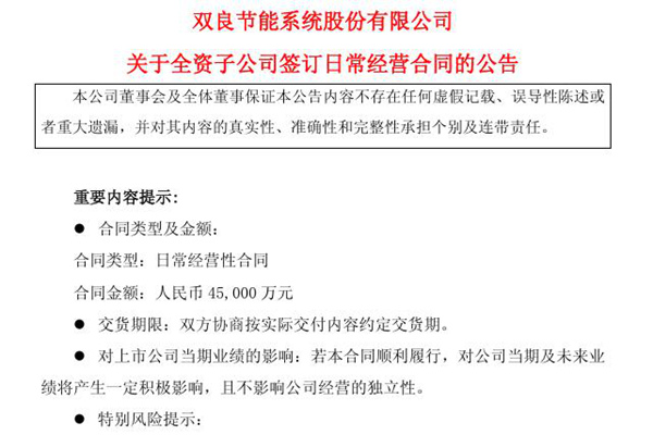 2025年06月12日,双良节能系统股份有限公司发布《关于全资子公司签订日常经营合同的公告》。图源:双良节能公告 双良节能全资子公司江苏双良新能源装备有限公司近日与闳扬新能源发展集团吉林有限公司签订了《闳扬氢润能源科技(福海)有限公司福海县光储氢氨醇一体化项目买卖合同》,合同供货标的为绿电制氢系统,合同金额为人民币45,000万元。...
