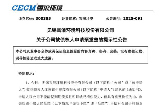 无锡雪浪环境科技股份有限公司(简称:雪浪环境)近日公告称,公司收到了债权人江苏鑫牛线缆有限公司(下称“申请人”)送达的《通知书》,申请人以公司不能清偿到期债务且明显缺乏清偿能力,但具有重整价值为由,向无锡市中级人民法院(下称“无锡中院”)申请对公司进行预重整。 截至本公告披露日,雪浪环...