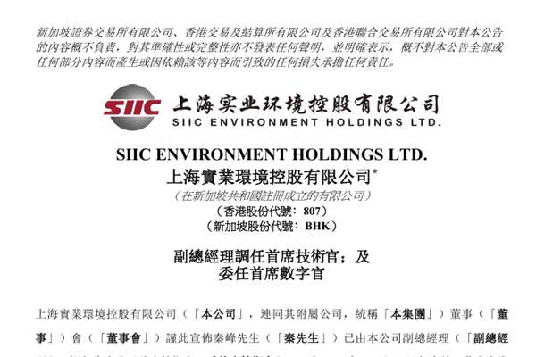 上海实业环境控股有限公司(简称:上海实业环境)近日公告称,秦峰先生已由公司副总经理调任为首席技术官,自2025年11月19日起生效。董事会进一步宣布,刘浩江先生已获委任为公司首席数字官,自2025年11月19日起生效。 秦峰及刘浩江的履历详情载列如下: 秦峰,56岁,主要负责本集团技术应用与创新。秦先生于 2020 年 5 月加入...