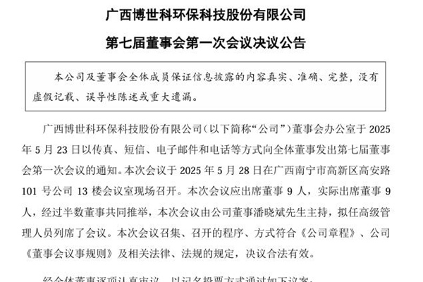 2025年05月28日,广西博世科环保科技股份有限公司发布《第七届董事会第一次会议决议公告》。图源:博世科公告 博世科第七届董事会第一次会议审议通过《关于推选公司第七届董事会董事长的议案》 ,审议通过《关于推选公司第七届董事会副董事长的议案》 ,审议通过《关于推选公司第七届董事会各专门委员会委员的议案》,审议通过《关于聘任公司经理的...