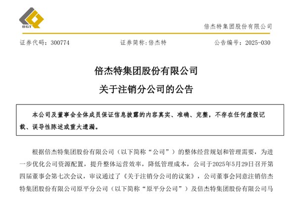 倍杰特集团股份有限公司(简称:倍杰特)近日公告称,为进一步优化公司资源配置,提升整体运营效率,降低管理成本,公司决定注销倍杰特集团股份有限公司原平分公司(下称“原平分公司”)及倍杰特集团股份有限公司马鞍山分公司(下称“马鞍山分公司”)并授权公司管理层负责办理注销原平分公司及马鞍山分公司相...