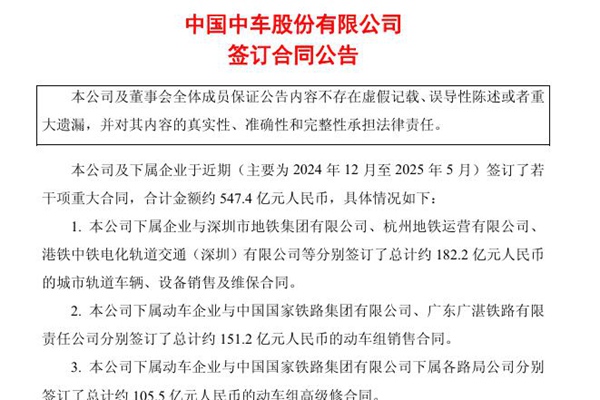 2025年05月13日,中国中车股份有限公司发布《签订合同公告》。图源:中国中车公告 公告称,公司及下属企业于近期(主要为2024年12月至2025年5月)签订了若干项重大合同,合计金额约547.4亿元人民币,合同总金额约占本公司中国会计准则下2024年营业收入的22.2%。 其中,公司下属企业与内蒙古三峡蒙能能源有限公司、金风科...