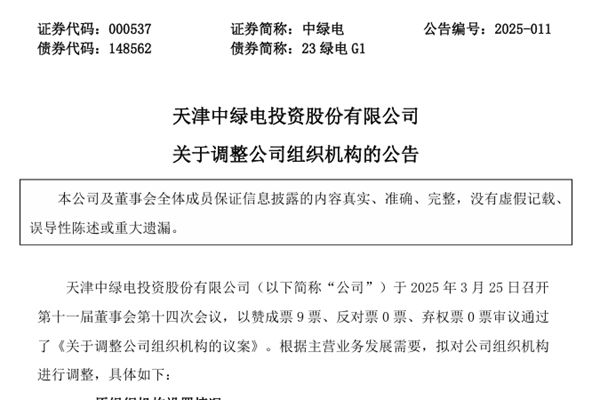 近日,天津中绿电投资股份有限公司(简称:中绿电)公告称,将在现有基础上,增设电力营销部,对各区域电力市场政策进行深入研究,精准把握市场动态,制定灵活高效的营销策略,助推公司可持续高质量发展。 本次组织机构调整后,中绿电共有部门14个,具体包括:综合管理部、党委组织部(人力资源部)、党委党建部(党委宣传部)、党委巡察办(廉政办)、纪委...
