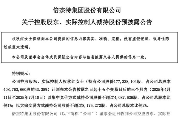 2025年03月20日,倍杰特集团股份有限公司发布《关于控股股东、实际控制人减持股份预披露公告》。图源:倍杰特公告 公司控股股东、实际控制人权秋红女士(持有公司股份177,338,104股,占公司总股本408,763,660股的43.38%)计划在本公告披露之日起十五个交易日后的三个月内(2025年4月11日至2025年7月10日...