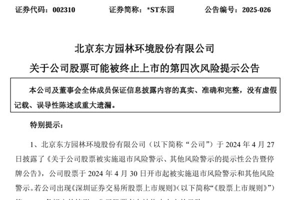 北京东方园林环境股份有限公司(简称:*ST东园,下称“东方园林”)近日发布《关于公司股票可能被终止上市的第四次风险提示公告》。据悉,这已是东方园林三个月来第四次发布公司股票可能被终止上市的风险提示,前三次分别在1月24日、2月15日、3月1日。 东方园林表示,若公司2024年度经审计财务报告触及《股票上市规则...