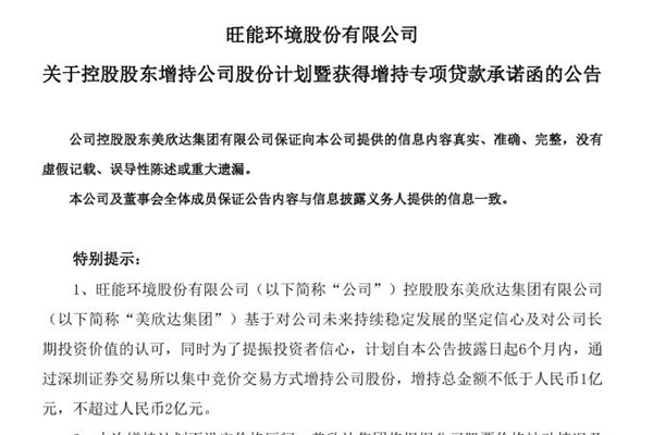 2025年03月13日,旺能环境股份有限公司发布《关于控股股东增持公司股份计划暨获得增持专项贷款承诺函的公告》。图源:旺能环境公告 旺能环境控股股东美欣达集团有限公司基于对公司未来持续稳定发展的坚定信心及对公司长期投资价值的认可,同时为了提振投资者信心,计划自本公告披露日起6个月内,通过深圳证券交易所以集中竞价交易方式增持公司股份,...