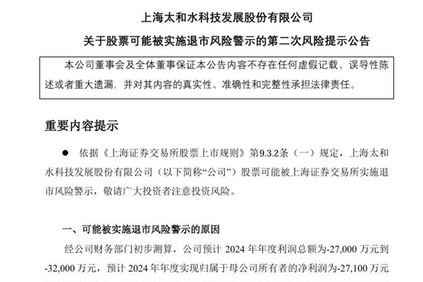 2025年03月11日,上海太和水科技发展股份有限公司发布《关于股票可能被实施退市风险警示的第二次风险提示公告》。图源:太和水公告 如公司 2024 年度经审计的利润总额、净利润或者扣除非经常性损益后的净利润孰低者为负值且扣除与主营业务无关的业务收入和不具备商业实质的收入后的营业收入低于3亿元,将触及《上海证券交易所股票上市规则》...