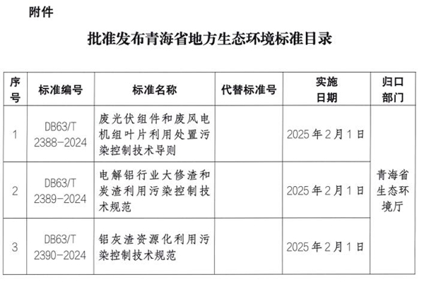 关于批准发布《废光伏组件和废风电机组叶片利用处置污染控制技术导则》等3项青海省地方生态环境标准的公告 青海省生态环境厅、青海省市场监督管理局批准《农废光伏组件和废风电机组叶片利用处置污染控制技术导则》等3项青海省地方生态环境标准,现予以公布。 附件:批准发布青海省地方生态环境标准目录 青海省生态环境厅 青海省市场监督管理局 20...