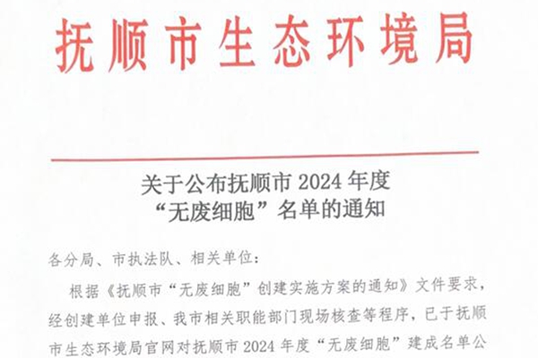 关于公布抚顺市2024年度“无废细胞”名单的通知 各分局、市执法队、相关单位: 根据《抚顺市“无废细胞”创建实施方案的通知》文件要求,经创建单位申报、我市相关职能部门现场核查等程序,已于抚顺市生态环境局对抚顺市2024年度“无废细胞”建成名单公示7日,未收到反馈意...