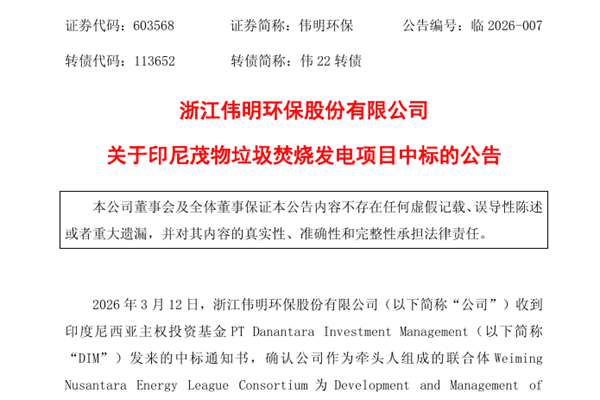 浙江伟明环保股份有限公司(简称:伟明环保)公告称,3月12日,公司收到了印度尼西亚主权投资基金PT Danantara Investment Management(以下简称“DIM”)发来的中标通知书,确认公司作为牵头人组成的联合体WeimingNusantara Energy League Consortiu...