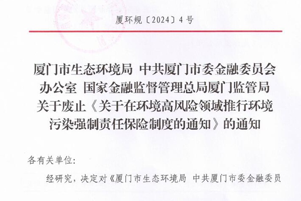 厦门市生态环境局 中共厦门市委金融委员会办公室 国家金融监督管理总局厦门监管局关于废止《关于在环境高风险领域推行环境污染强制责任保险制度的通知》的通知厦环规〔2024〕4号 经研究,决定对《厦门市生态环境局 中共厦门市委金融委员会办公室 国家金融监督管理总局厦门监管局关于在环境高风险领域推行环境污染强制责任保险制度的通知》(厦环规〔20...