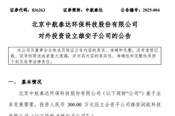 北京中航泰达环保科技股份有限公司(简称:中航泰达)1月14日公告称,基于业务发展需要,公司将投资人民币300.00万元设立全资子公司雄安润航科技有限公司(下称“雄安子公司”)。 雄安子公司经营范围主要涉及环保、新能源及建筑工程三大领域,包括太阳能热利用产品销售;太阳能发电技术服务;土壤环境污染防治服务;土壤污...