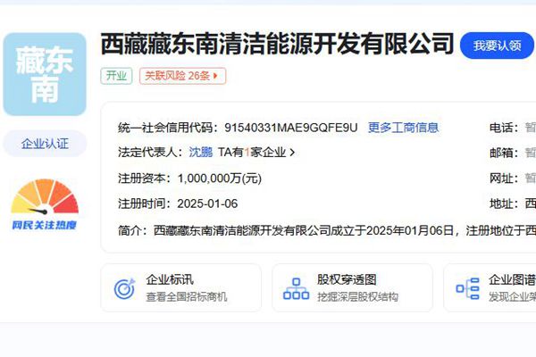1月6日,西藏藏东南清洁能源开发有限公司正式成立,注册资本高达100亿元,经营范围包括: 【许可项目】发电业务、输电业务、供(配)电业务;供电业务;输电、供电、受电电力设施的安装、维修和试验(依法须经批准的项目,经相关部门批准后方可开展经营活动,具体经营项目以相关部门许可证件为准) 【一般项目】新兴能源技术研发;太阳能发电技术服务...