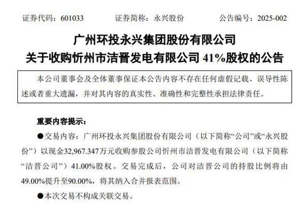 广州环投永兴集团股份有限公司(简称:永兴股份)近日发布公告称,公司将以现金32,967.347万元收购参股公司忻州市洁晋发电有限公司(下称“洁晋公司”)41.00%股权。交易完成后,永兴股份对洁晋公司的持股比例将由49.00%提升至90.00%,将其纳入合并报表范围。本次交易不构成关联交易。本次交易不构成重大资...
