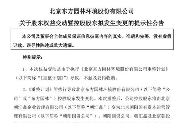 2025年01月10日,北京东方园林环境股份有限公司发布《关于股东权益变动暨控股股东拟发生变更的提示性公告》。图源:东方园林公告 公告显示,本次重整后,公司控股股东将由北京朝汇鑫企业管理有限公司变为北京朝阳国有资本运营管理有限公司。朝阳国资公司、朝汇鑫及北京朝投发投资管理有限公司-北京市盈润汇民基金管理中心(有限合伙)为同一实际控制...