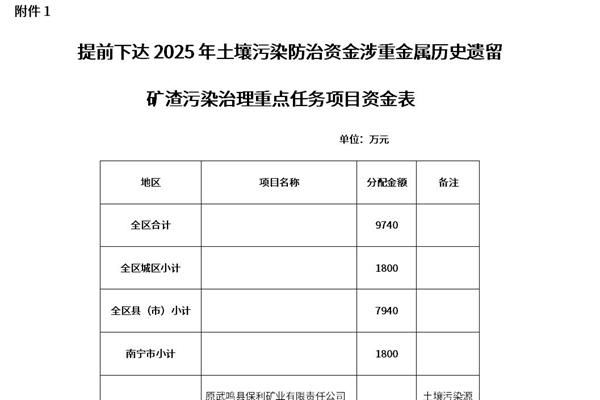 广西壮族自治区财政厅关于提前下达2025年土壤污染防治资金预算(涉重金属历史遗留矿渣污染治理重点任务项目)的通知桂财资环〔2024〕88号 有关市、县(市、区)财政局: 根据《财政部关于提前下达2025年土壤污染防治资金预算的通知》(财资环〔2024〕130号),现提前下达你市、县(市、区)2025年土壤污染防治资金预算,专项用于涉重...