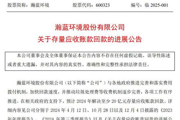 瀚蓝环境12月31日晚公告,公司2024年度累计收到2023年及以前年度的存量应收账款回款约24亿元。 瀚蓝环境表示,公司与各地政府推进完善和落实费用拨付机制,加快回款速度,并推动垃圾处理费等收费机制逐步完善,各项工作有序推进。存量应收账款的回款,将对公司2024年度经营业绩和财务状况产生积极影响。图源:瀚蓝环境公告 申明:本站发...