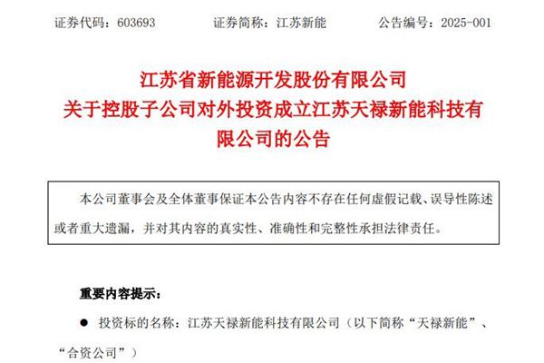 江苏省新能源开发股份有限公司(简称:江苏新能)近日发布公告称,将参与设立合资公司——江苏天禄新能科技有限公司,注册资本5000万元。其中,江苏新能控股子公司江苏新能投资管理有限公司(下称“新能投资公司”)出资 2,550 万元,占注册资本的 51%,东部机场集团投资有限公司(下称&ldq...