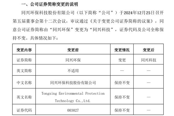 2024年12月26日,同兴环保科技股份有限公司发布《关于变更公司证券简称的公告》。图源:同兴科技公告 公告称,同兴环保科技股份有限公司于2024年12月25日召开第五届董事会第十二次会议,审议通过《关于变更公司证券简称的议案》,同意公司证券简称由“同兴环保”变更为“同兴科技”,证券代...