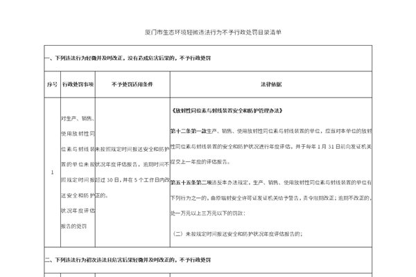 厦门市生态环境局关于印发《厦门市生态环境领域轻微违法行为不予行政处罚实施办法》的通知 局机关各处室、各驻区局,各直属事业单位: 为深入贯彻落实习近平法治思想,进一步优化法治营商环境,我市生态环境执法领域推行不予行政处罚制度,进一步推行包容审慎监管执法,依据《中华人民共和国行政处罚法》《福建省行政执法条例》《福建省生态环境行政处罚裁量规...