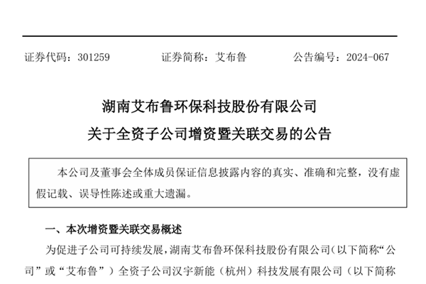 2024年11月29日,湖南艾布鲁环保科技股份有限公司发布《关于全资子公司增资暨关联交易的公告》。内容概述如下: 为促进子公司可持续发展,湖南艾布鲁环保科技股份有限公司(以下简称“公司”或“艾布鲁”)全资子公司汉宇新能(杭州)科技发展有限公司(以下简称“汉宇新能&rdquo...
