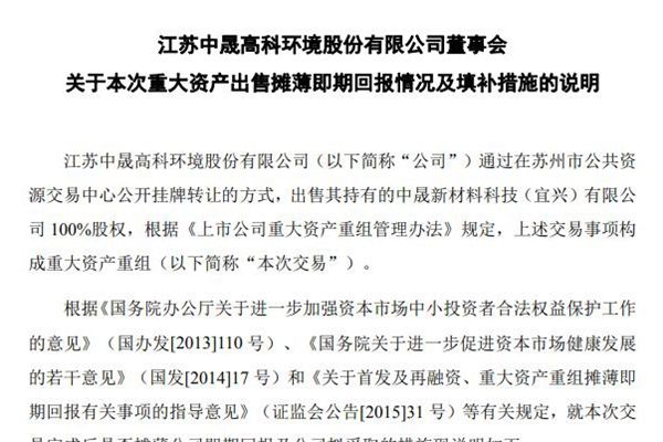 江苏中晟高科环境股份有限公司(简称:中晟高科)近日公告称,公司通过在苏州市公共资源交易中心公开挂牌转让的方式,出售持有的中晟新材料科技(宜兴)有限公司 100%股权,根据《上市公司重大资产重组管理办法》规定,上述交易事项构成重大资产重组。 中晟高科表示,本次交易前,公司 2023 年、2024 年 1-8 月实现的基本每股收益分别为...