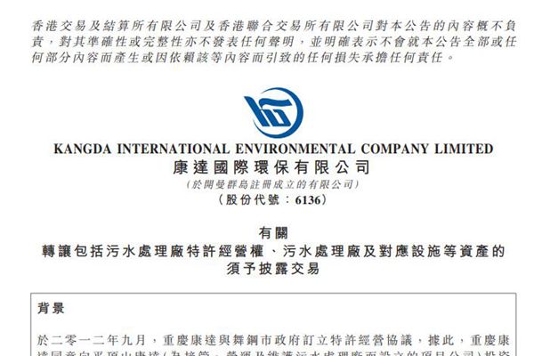 港股康达国际环保有限公司(简称:康达环保)近日发布《有关转让包括污水处理厂特许经营权、污水处理厂及对应设施等资产的须予披露交易》。 据该公告,11月18日,重庆康达及平顶山康达(作为转让方)、舞钢市洁源(作为受让方)与舞钢市政府订立资产转让协议,转让方同意出售而舞钢市洁源同意收购相关资产,代价为人民币5700万元。相关资产包括但不...