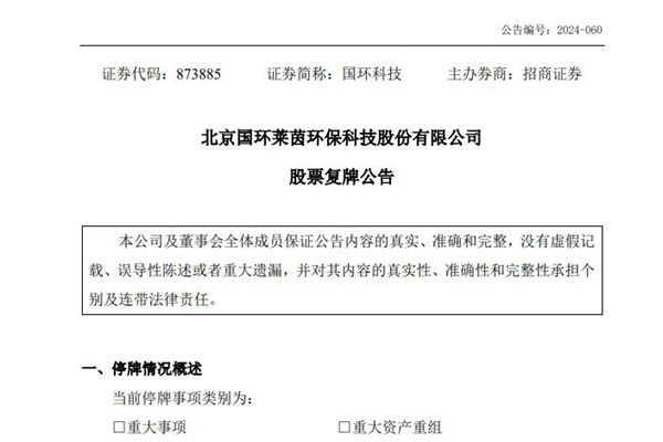 北京国环莱茵环保科技股份有限公司(简称:国环科技)近日公告称,公司股票将自 2024 年 11 月 12 日起复牌。 国环科技是一家拥有自主知识产权的创新型独立设备供应商,能够提供处理高浓度有机废水所需的外置式膜生物反应器(MBR)和高效厌氧反应器等先进设备,以及以自身拥有的核心设备技术为客户提供专业先进的污废水处理解决方案,如设备...