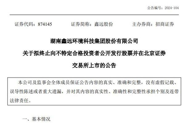 新三板上市公司湖南鑫远环境科技集团股份有限公司(简称:鑫远股份)近日公告称,基于公司未来发展战略规划调整,经认真研究和审慎决定,公司拟终止向不特定合格投资者公开发行股票并在北京证券交易所上市申请。 鑫远股份成立于2006年,是一家集投资建设、运营维护、技术应用、环境检测于一体的专业水生态环境保护综合服务商。自成立以来,鑫远股份始终以...