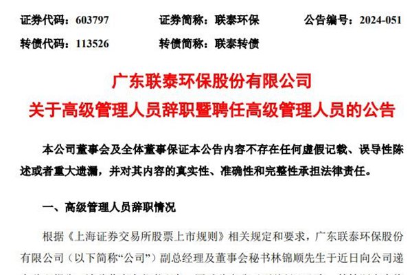 11月7日,广东联泰环保股份有限公司(简称:联泰环保)发布关于高级管理人员辞职暨聘任高级管理人员的公告,副总经理及董事会秘书林锦顺先生于近日向公司递交辞职报告,请辞董事会秘书职务,同时辞去公司副总经理职务。 经公司董事会提名委员会审核通过,公司董事会同意聘李启亮先生任公司董事会秘书、副总经理。 李启亮先生简历 李启亮,1989年...