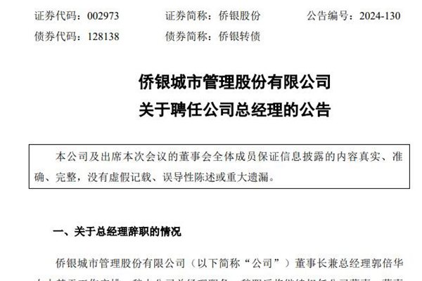 11月6日,侨银城市管理股份有限公司(简称:侨银股份)公告,公司董事长兼总经理郭倍华基于工作安排,辞去公司总经理职务,辞职后将继续担任公司董事、董事长、法定代表人职务。 侨银股份于2024年11月6日召开第三届董事会第二十三次会议,审议通过了《关于聘任公司总经理的议案》,同意聘任夏冠明担任公司总经理,任期自公司本次董事会审议通过之日...