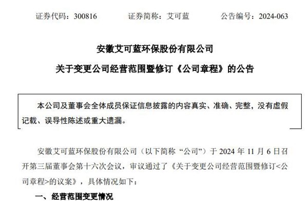 安徽艾可蓝环保股份有限公司(简称:艾可蓝)近日公告称,因业务发展需要,公司拟对经营范围作出变更,新增以下内容: 电池销售;电池制造;新能源汽车电附件销售;电池零配件生产;电池零配件销售;新兴能源技术研发;合成材料制造(不含危险化学品);合成材料销售;再生资源回收(除生产性废旧金属);资源再生利用技术研发;再生资源销售;石墨及碳素制品...