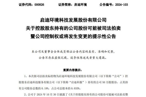11月7日,启迪环境科技发展股份有限公司(简称:启迪环境)发布关于控股股东持有的公司股份可能被司法拍卖暨公司控制权或将发生变更的提示性公告。 公告指出,启迪科技服务有限公司持有的启迪环境50万股股份将于2024年12月4日至5日进行公开拍卖,该股份占其持有启迪环境股份总数的0.18%,占启迪环境总股本的0.035%。此外,启迪科技服...