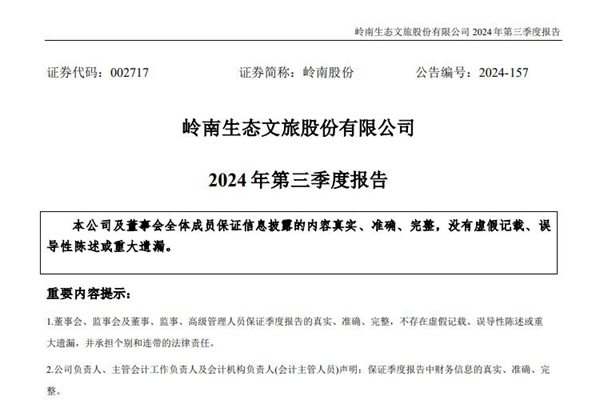 岭南生态文旅股份有限公司(简称:岭南股份)近日发布《2024 年第三季度报告》,前三季度共实现营业收入8.05亿元,同比下降51.02%;归母净利润亏损2.72亿元,上年同期亏损2.06亿元;扣非净利润亏损3.47亿元,上年同期亏损2.17亿元;经营活动产生的现金流量净额为-3.25亿元,上年同期为-2.97亿元;报告期内,岭南股份基...