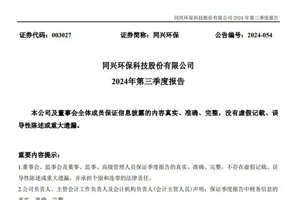 同兴环保10月30日晚间发布三季度业绩公告称,2024年前三季度营收约4.06亿元,同比减少23.93%;归属于上市公司股东的净利润约1950万元,同比减少30.63%;基本每股收益0.15元,同比减少28.57%。图源:同兴环保公告 同兴环保创立于2006年,深交所主板上市企业,主营业务包括:烟气治理环保工程总承包;低温SCR脱硝...