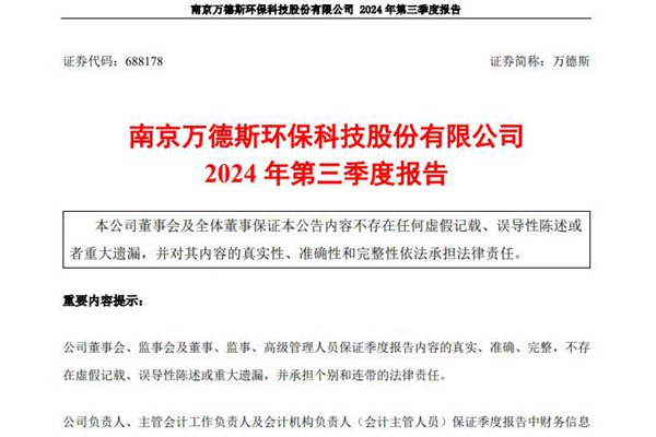 南京万德斯环保科技股份有限公司(简称:万德斯)近日发布《2024年第三季度报告》,前三季度实现营业收入4.06亿元,同比下降33.19%;归属于上市公司股东的净利润475.44万元,同比下降76.50%;归属于上市公司股东的扣除非经常性损益的净利润277.32万元,同比下降66.75%;基本每股收益0.0559元/股。图源:万德斯环保...