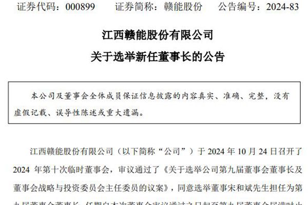 近日,A股电力国企上市公司江西赣能股份有限公司(简称:赣能股份)发布重磅公告称,经2024年第十次临时董事会审议决定,选举宋和斌先生为第九届董事会董事长,其任期将自审议通过之日起至本届董事会任期届满为止。 同时,宋和斌还将担任公司董事会战略与投资委员会主任委员,并成为公司新任法定代表人。公司将尽快完成相关工商登记变更手续。 就在3...