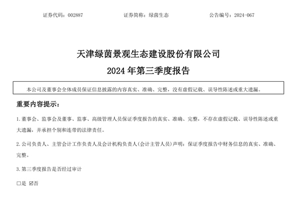 天津绿茵景观生态建设股份有限公司(简称:绿茵生态)日前公布《2024年第三季度报告》,2024年1-9月实现营业收入2.44亿元,同比减少0.83%;归母净利润5164.62万元,同比下降32.77%;扣非净利润4394.44万元,同比下降40.56%;经营活动产生的现金流量净额为-1557.86万元。截至本报告期末,公司总资产42....