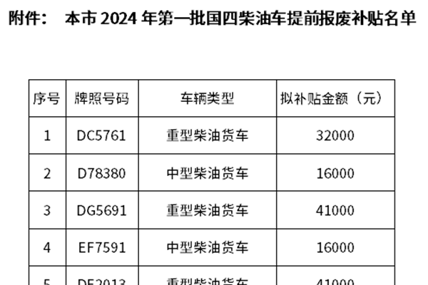 关于本市2024年第一批国四柴油车提前报废补贴名单的公示 根据《上海市生态环境局上海市发展和改革委员会上海市财政局关于印发〈上海市鼓励国四柴油车淘汰更新补贴资金管理办法〉的通知》(沪环规〔2024〕10号)规定,我局组织开展了国四柴油车提前报废补贴审核。现将经过初审符合要求拟予补贴的本市2024年第一批国四柴油车提前报废补贴名单进行公示...