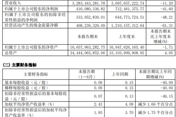 《重庆水务2024年半年度报告》日前发布,2024年1-6月,公司实现营收32.83亿元,降幅11.2%;实现归属于上市公司股东的净利润4.16亿元,降幅41.6%。基本每股收益0.09元。截至本报告期末,公司总资产344.44亿元,归属于上市公司股东的净资产166.58亿元。 重庆水务提及,①营业收入和净利润减少的主要原因系上年同...