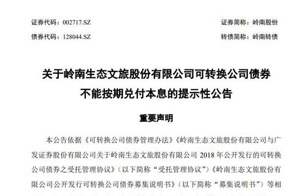 8月14日,岭南生态文旅股份有限公司(简称:岭南股份)发布《不能按期兑付本息的提示性公告》,明确公司现有货币资金已无法偿付“2018年岭南生态文旅股份有限公司公开发行可转换公司债券”(简称:岭南转债)。而且,截至公告日,岭南股份仍未能筹集到兑付本息资金。因此,无法按期兑付本息。 据《关于岭南转债可能存在不能按...