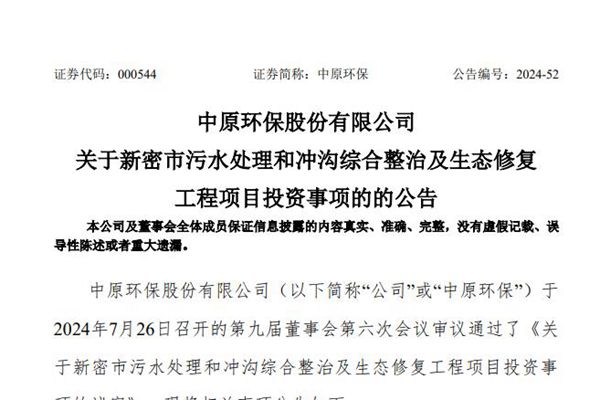 中原环保股份有限公司(简称:中原环保)7月30日公告称,公司第九届董事会第六次会议审议通过了《关于新密市污水处理和冲沟综合整治及生态修复工程项目(下称“新密项目”)投资事项的议案》。该议案提示,因外部环境变化,新密项目48785万元财政补助资金到位时间尚不确定,经与新密市城市管理局协商,双方拟按PPP合同约定的...