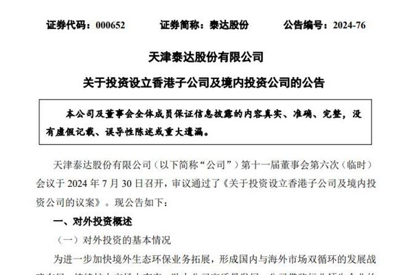 天津泰达股份有限公司(简称:泰达股份)近日公告称,为进一步加快境外生态环保业务拓展,形成国内与海外市场双循环的发展战略布局,持续扩大市场占有率,公司将以自有资金出资设立全资子公司泰达环境(香港)有限公司(暂定名,下称“香港子公司”),积极参与海外项目。香港子公司注册资本为 800 万美元,其中公司出资 800 ...