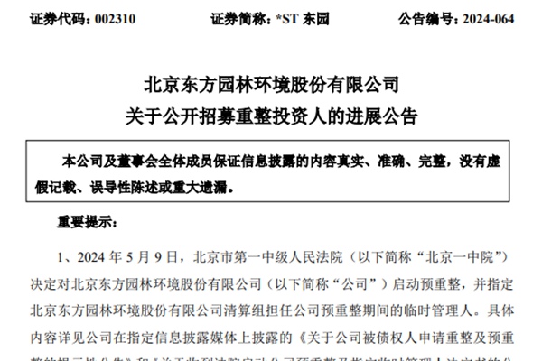 2024年7月27日,东方园林发布《关于公开招募重整投资人的进展公告》。公告显示,截至2024年7月24日,共有 20 名意向投资人报名。下一步,临时管理人将对意向投资人提交的报名材料进行初步审查,并通知通过初步审查的意向投资人缴纳报名保证金。公司将积极配合意向投资人开展尽职调查。 需要注意的是,目前公司处于预重整阶段,尚未收到法院...