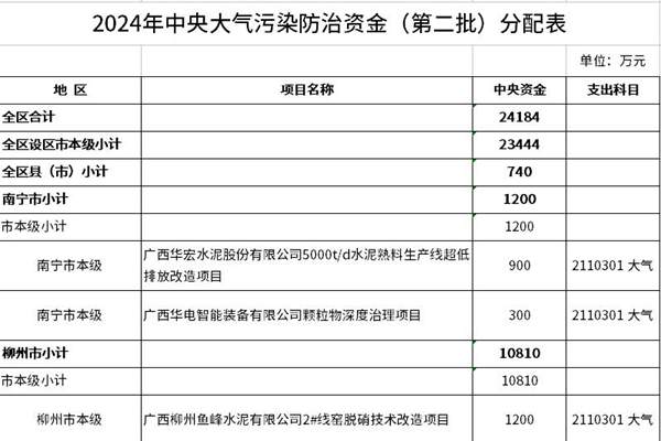 广西壮族自治区财政厅下达2024年中央大气污染防治资金(第二批)预算,全区共下达资金24184万元。 广西壮族自治区财政厅关于下达2024年中央大气污染防治资金(第二批)预算的通知 桂财资环〔2024〕53号 有关市、县(市)财政局: 为支持大气污染防治工作,促进大气质量改善,根据《财政部关于下达2024年度大气污染防治资金(...